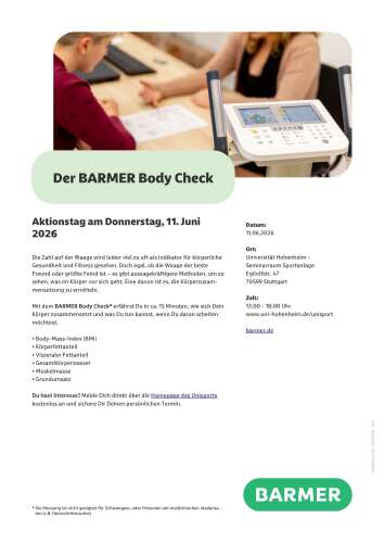 | 403730 | Body Check (Barmer) - Termin 2 (11.06.26) 403730 Body Check (Barmer) - Termin 2 (11.06.26) 11.06.2026 | | 11.06. | Sonja Salmen | entgeltfreientgeltfrei / free of charge | ab 08.04., 10:00 |